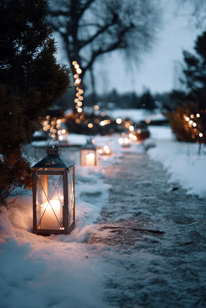 I just think this snow-dusted walkway is utterly enchanting; it’s the picture of cozy, peaceful winter elegance! The contrast between the icy blue surroundings and the super warm candle glow is simply stunning, making the whole scene feel instantly inviting and romantic. If you’re into that beautiful, crisp winter atmosphere, this look is absolutely perfect. I love how the little details, like the subtle twinkle of the fairy lights in the background, give the whole setup an extra layer of magic. This would make any entrance feel like stepping into a beautiful, quiet holiday dream!