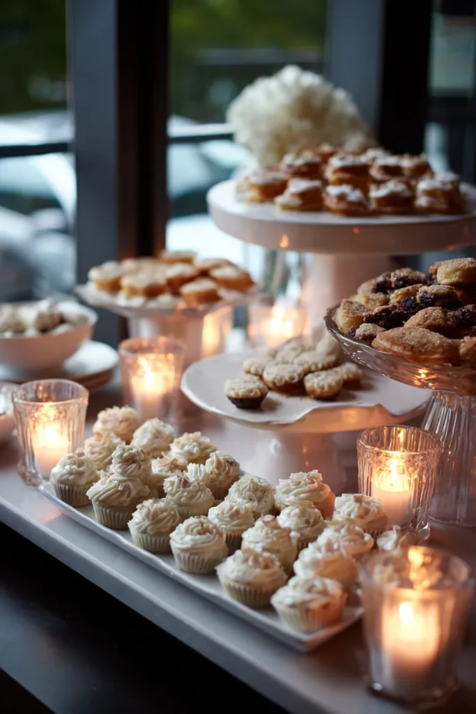 This charming dessert display is the perfect example of how to make a sweet table feel incredibly warm and intimate, even with a modern backdrop. The spread is placed right along a sleek, dark-framed window, which lets the soft outside light filter in for a beautifully moody atmosphere. Treats are piled high on clean white platters and elevated serving dishes of varying heights, with tons of little white frosted mini cupcakes taking center stage. The whole scene is bathed in the warm, inviting glow of dozens of small votive candles nestled between the platters, many housed in sparkling, slightly antiqued glass holders. The warm candlelight truly makes those white sweets look like little jewels!