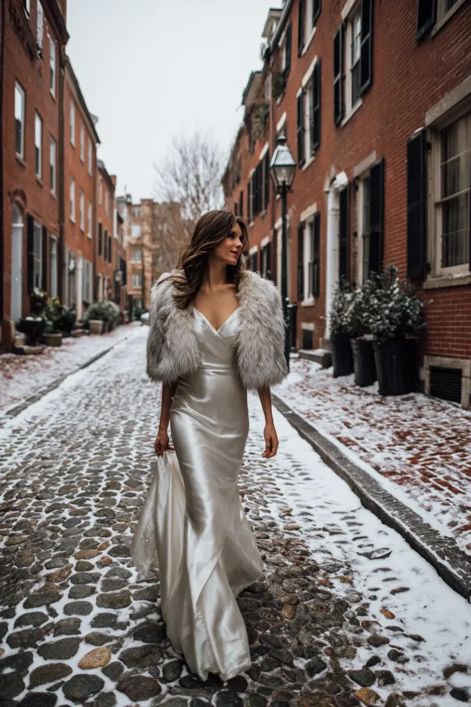 This is such a dreamy look for a winter bride. It features a gorgeous silky satin slip wedding dress in a soft, ethereal ivory hue, perfectly embodying minimalist elegance. The dress has a flattering V-neckline and a subtle A-line silhouette that drapes beautifully as the model walks down the snowy cobblestone street. To really amp up the winter glamour, she’s paired it with a cozy yet luxurious faux fur stole or wrap in a light grey or silvery tone, adding both warmth and a huge dose of old-Hollywood chic. The overall vibe is effortlessly sophisticated, blending the crispness of a winter day with the luxurious feel of high-end fabrics.