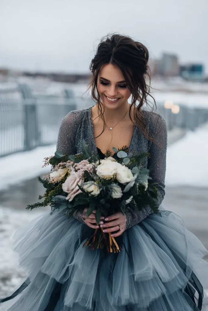 This is such a fun and unexpected look for the unconventional winter bride, truly embracing those icy tones. She’s wearing a dreamy two-piece ensemble featuring a voluminous, layered tulle skirt in a gorgeous, muted dusty blue or stormy grey color that mimics the winter sky. Up top, she’s layered a stunning sheer long-sleeved shrug or bolero in a shimmering silver-grey over a dark bodice, giving it a beautiful glittering effect. The overall feeling is glamorous, whimsical, and definitely unique, perfectly capturing the magic of a snowy day.