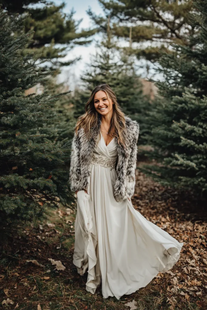 This is such a gorgeous look for a rustic yet high-fashion winter wedding in a beautiful woodland setting. The bride is wearing a flowing V-neck gown in a soft, creamy ivory fabric like chiffon or crepe that moves beautifully with her. The dress is cinched at the waist with a stunning wide, beaded belt that adds a touch of intricate sparkle. The true winter star here is her outer layer: a super cozy and dramatic faux fur jacket in a stylish mix of white, grey, and black tones. The overall vibe is glamorous bohemian, blending natural, soft fabrics with luxurious, warm textures.