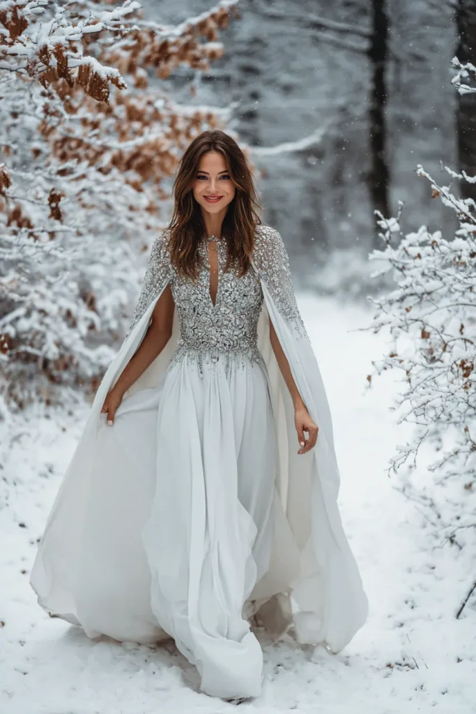 I totally think this outfit is a showstopper because that bejeweled cape is everything you need for a truly dramatic entrance in the winter. Some people love capes because they give you that feeling of being covered and warm without the bulk of a coat, and this one adds such a regal touch. The contrast between the heavily ornate, sparkling bodice and the simple, flowing skirt is incredibly flattering, drawing the eye upward and cinching the waist beautifully. It’s a chic and modern take on a bridal ballgown that is meant to sparkle against the snow.