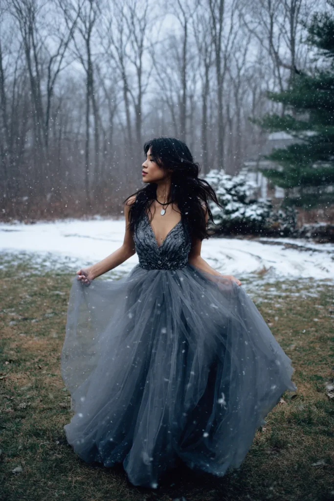 I just adore this outfit because it’s such a bold and beautiful departure from traditional white, making a powerful statement. The dark grey tulle is so striking against the white snow, giving off a fairytale-meets-modern vibe. The beaded bodice is incredibly eye-catching and sparkly, adding that touch of glamour that every bride deserves, and it beautifully defines the waist before flowing into the full skirt. It’s truly a flattering option if you want to be a memorable winter bride who isn’t afraid to embrace a darker, more artistic palette.