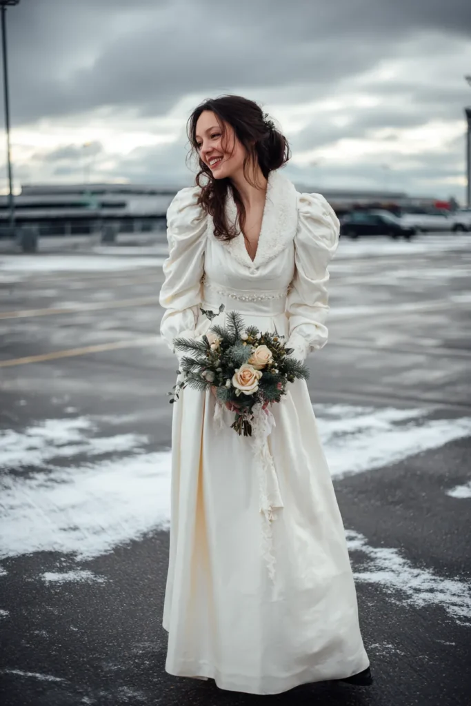 I think this outfit is a winner for anyone who loves that classic, slightly retro bridal look because the puffed sleeves offer incredible structure and drama without needing a ton of jewelry. The faux fur collar is such a genius addition for a cold-weather wedding; it frames the face beautifully and provides extra warmth where you need it most. The fabric choice feels luxurious and structured, which is super flattering and gives the overall silhouette a really polished, upscale feel that stands up beautifully against the cold, gray sky.