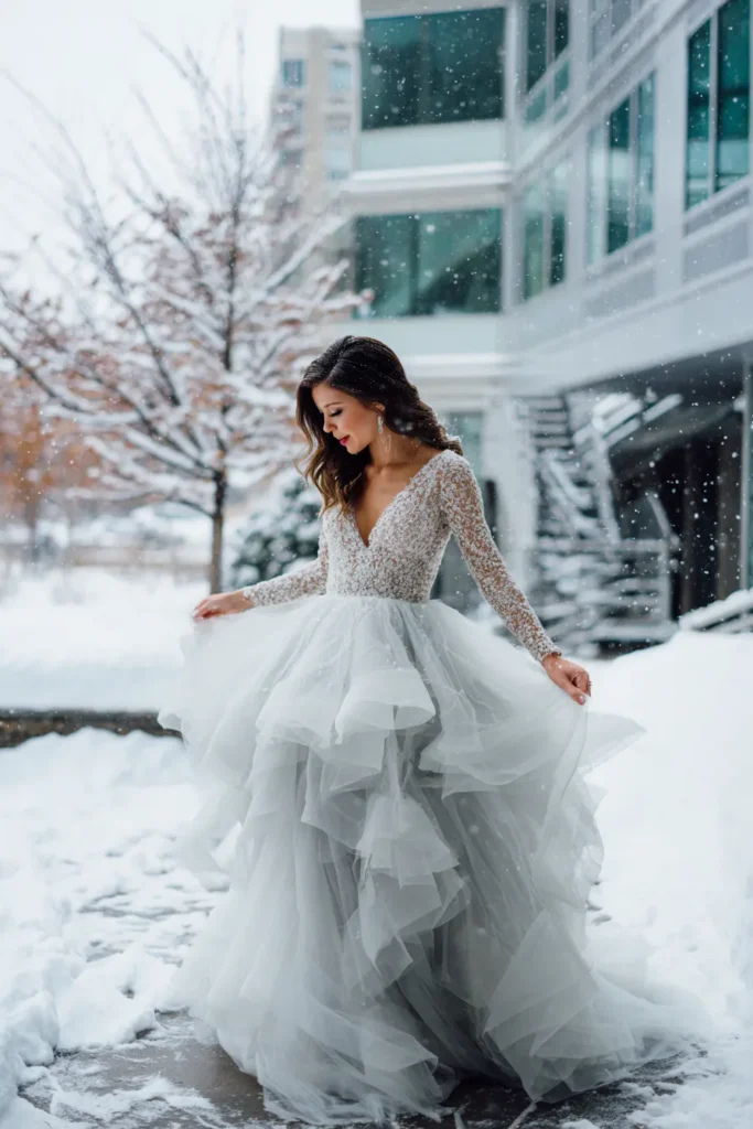 This is such a stunning choice for the bride who wants that dramatic, fairytale ballgown moment with a unique twist for winter. She is wearing an amazing long-sleeved gown with a deep plunging V-neckline that balances the drama of the skirt. The bodice is beautifully detailed with intricate white or silver lace appliqué, creating a striking contrast with the dreamy, voluminous skirt. The show-stopping skirt is made of layers of playful, soft ruffled tulle in a gorgeous icy blue-grey shade, making her look like she just stepped out of a snowdrift.