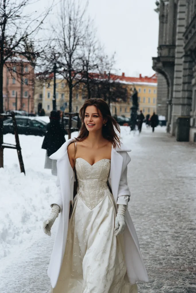 This bride is an absolute vision of sophisticated winter chic, blending bridal tradition with modern high fashion. She’s wearing a gorgeous strapless gown featuring a beautifully structured corset bodice in a pale ivory or antique white, detailed with delicate lace or embroidery. The skirt is full and flowing, made of a soft, textured fabric that is perfect for twirling. For an elegant and necessary layer of warmth, she’s draped in a stunning crisp white tailored long coat with wide lapels and accessorized with chic white knit gloves, proving you can be warm and fashionable at the same time.