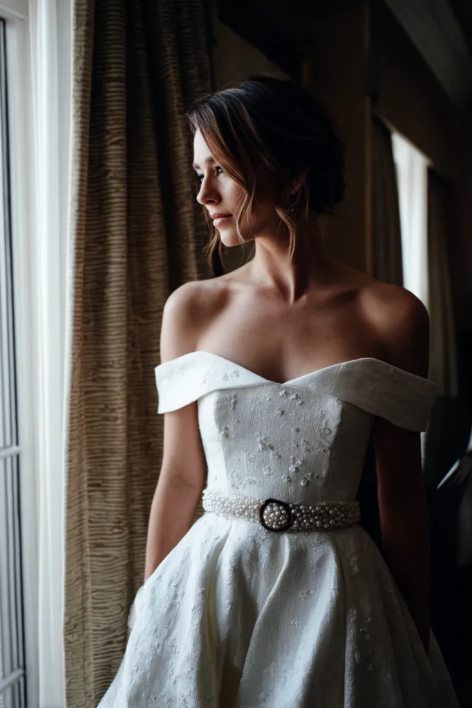 Elegant Off-the-Shoulder with Pearl Belt Accent