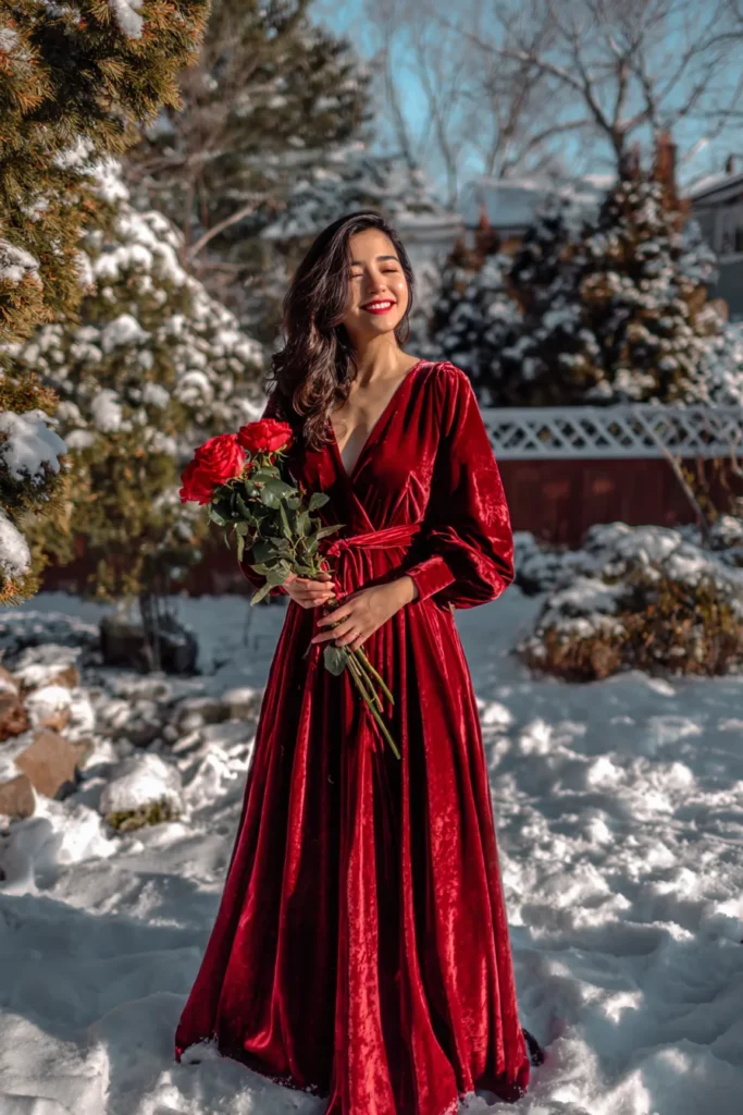 I think this outfit is a total knockout because the deep red velvet instantly brings that festive, opulent feeling that pairs so well with the winter season. The wrap style is one of the most figure-flattering designs out there, creating a beautiful hourglass shape while still being super comfortable and easy to move in. Plus, velvet is wonderfully warm and the light naturally catches it in such a gorgeous way, making the color look incredibly rich and vibrant against the white snow. It’s a bold choice that totally pays off in stunning, dramatic photographs.