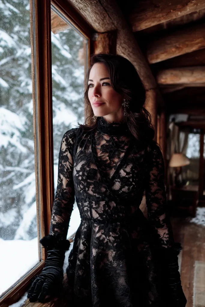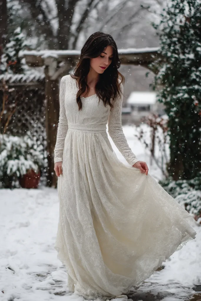 I totally think this outfit works because it achieves that perfect balance of being covered up yet still feeling light and ethereal. The lace on the sleeves and bodice provides that warmth and coverage that’s so important for winter, but the light, flowing skirt keeps the whole look from feeling heavy or stuffy. Since the dress itself has so much intricate texture with the lace and flowing fabric, you don’t need much jewelry, which makes the whole look feel really natural and effortless. It’s a beautifully flattering and comfortable choice for walking in a winter wonderland.