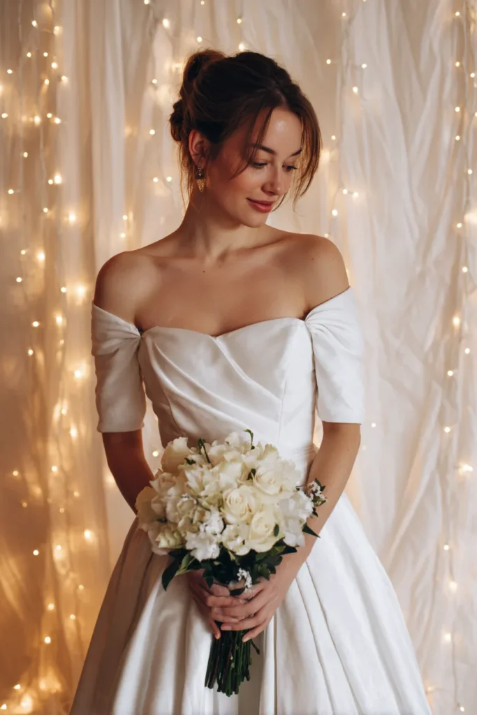 This is the ultimate romantic look for a grand winter wedding. This beautiful bride is wearing a classic ballgown made from a structured, crisp white satin or mikado fabric. The dress features a stunning off-the-shoulder neckline with draped sleeves that hit just at the bicep, giving it a very elegant and timeless feel. The bodice is structured, leading to a voluminous skirt that holds its shape beautifully. She’s keeping the accessories simple with a fresh bouquet of white roses and ranunculus and a subtle hint of gold jewelry. The backdrop of sheer fabric and twinkling fairy lights perfectly captures the cozy, magical atmosphere of a winter celebration.