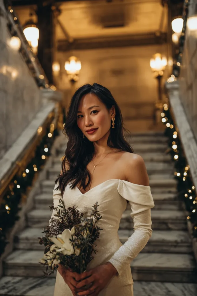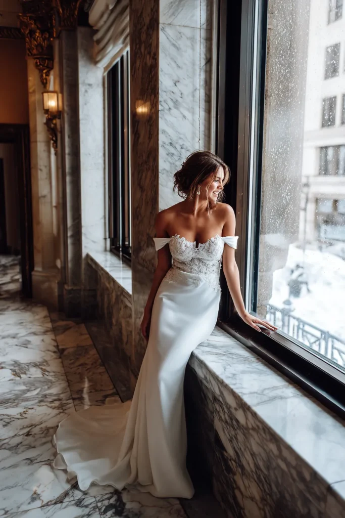 I think this outfit is a total winner because it proves you don’t need excessive fluff to make a statement; sometimes, sleek structure is everything. The combination of the romantic off-the-shoulder neckline with the practical and chic long sleeves is just brilliant for a winter ceremony. The fabric looks thick and substantial, which means it will hang beautifully and keep her cozy. This silhouette is incredibly flattering because it skims the body without clinging, giving her a long, lean line while the neckline opens up her face beautifully.