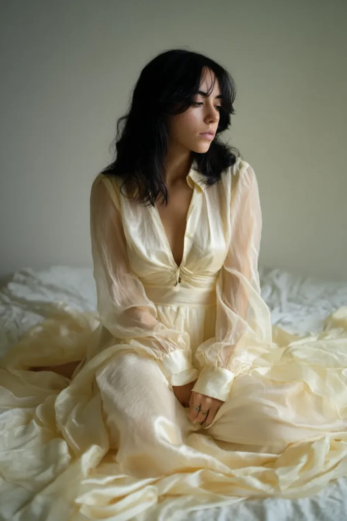 This is such a lovely, intimate look for a bride who prefers something soft, warm, and a little vintage for her winter morning photos or elopement. She’s wearing a delicate long-sleeved gown in a beautiful pale buttery yellow or champagne color, giving it a soft, candlelit glow. The dress looks like a blend of sheer silk or organza and a silky lining, with a flowing, voluminous skirt pooling around her. The top features a flattering V-neckline and a structured bodice with a wide waistband, and the sleeves are light and billowy. The overall vibe is sweet, ethereal, and beautifully retro.