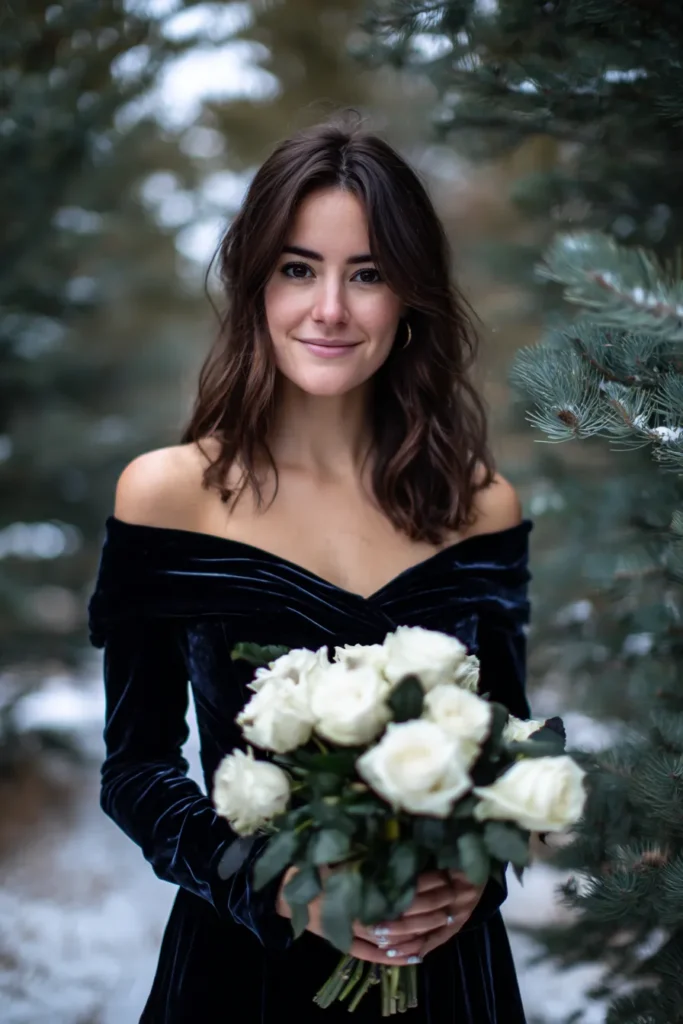 This is such a show-stopping look for a bride who embraces dramatic, sophisticated color in the winter. She is wearing a gorgeous off-the-shoulder gown in a deep, lush midnight blue velvet, which is just the most perfect luxurious fabric for the cold weather. The neckline features a soft, elegant fold over the shoulders, and the sleeves are long and fitted, offering beautiful coverage. The dress appears to be a slim A-line or column shape, letting the rich texture and color of the velvet do all the talking. She’s holding a stunning bouquet of white roses, which creates a striking and beautiful contrast against the dark dress and snowy trees.