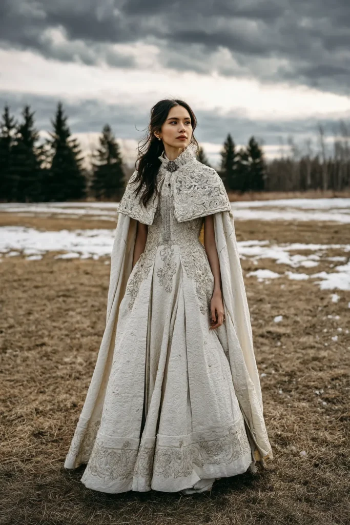 I’m completely obsessed with how powerful and sophisticated this outfit is, completely elevating the idea of a winter cover-up. The combination of the rich, heavy fabric and the high-neck cape is incredibly warm, dramatic, and just so chic for a cold-weather event, giving you warmth without a fuzzy coat. The defined bodice and full skirt create that desirable hourglass shape, which is universally flattering. That ornate cape provides such incredible movement and visual interest that you feel like you’re starring in your own epic fairytale.