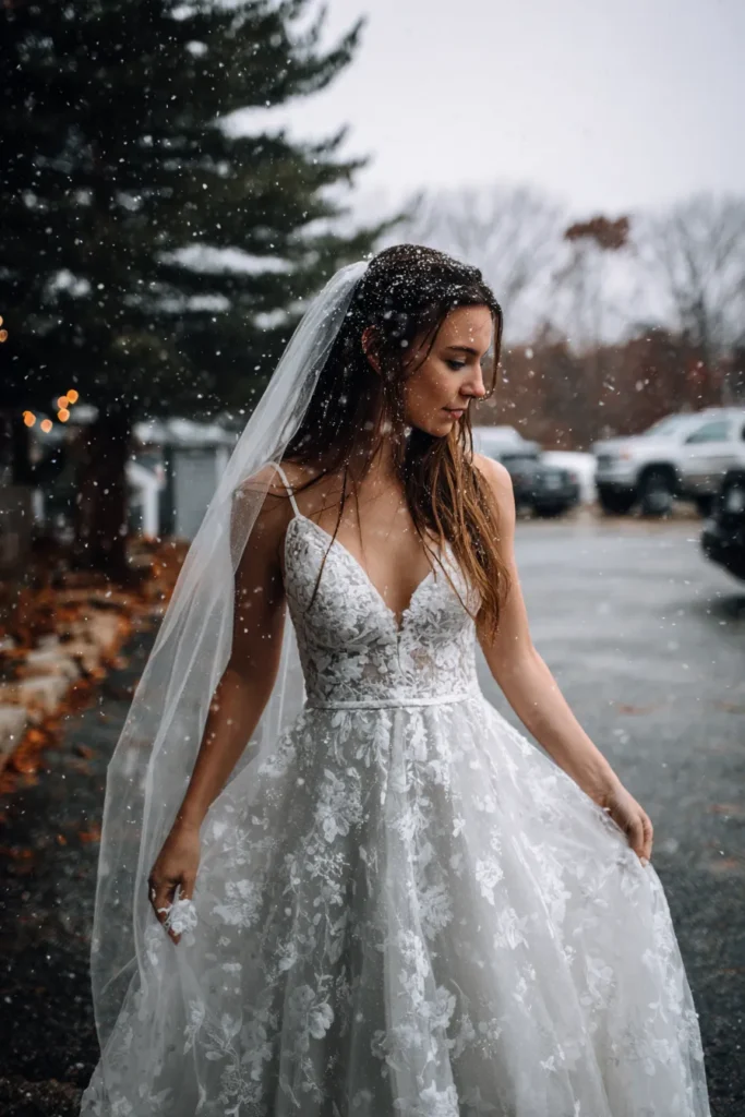 This bride looks absolutely ethereal standing in the falling snow, like a true winter goddess. She’s wearing a dreamy A-line wedding gown in a soft white or ivory shade, featuring delicate spaghetti straps and a flattering deep V-neckline. The entire dress is covered in beautiful, intricate floral lace appliqué, giving it a gorgeous texture that’s perfect for a rustic or bohemian celebration. The bodice is structured and cinched with a simple, thin ribbon-style belt, leading into a full, flowing skirt made of sheer tulle and lace. A simple fingertip-length veil completes this romantic, snow-kissed look.