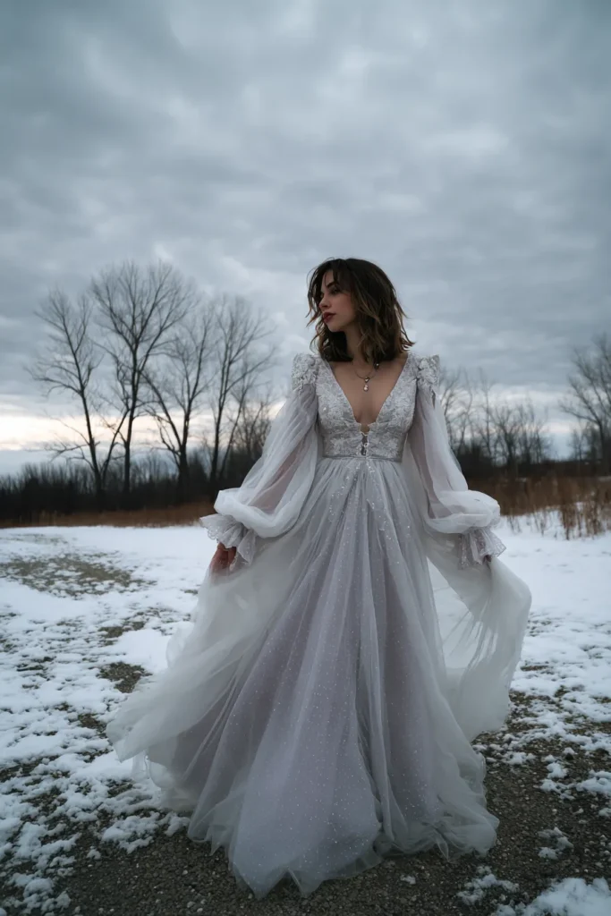 Oh my gosh, this dress is giving me total snow queen fairytale vibes. The bride is wearing an absolutely breathtaking ethereal gown in a silvery-white or pale grey shade that perfectly complements the winter sky. The dress features a deep plunging V-neckline and a fitted bodice adorned with intricate beading and embellishments on the shoulders and cuffs. But the real showstopper here is the sleeves: gorgeous, flowing sheer bishop sleeves that billow out and gather at the wrist, made of a light, delicate tulle. The A-line skirt is similarly dreamy, made of sparkling, sheer tulle that looks like freshly fallen snow.
