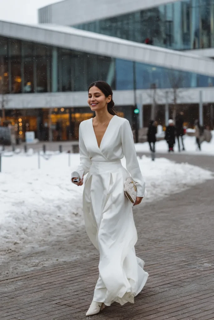 This look is absolutely perfect for the bride who loves modern minimalism with a touch of playful sophistication. She’s wearing a stunning long-sleeved wrap wedding dress in a brilliant crisp white or ivory, made from a fabric that looks like luxurious satin or crepe with a beautiful flow. The top features a flattering V-neck wrap style, and the sleeves are relaxed but elegant. The skirt is full and flowing with some lovely pleating at the waist, giving it a bit of volume and movement. She’s accessorized with a shimmering textured clutch and sleek white ankle boots, making it a very fashion-forward and incredibly cool winter wedding outfit.