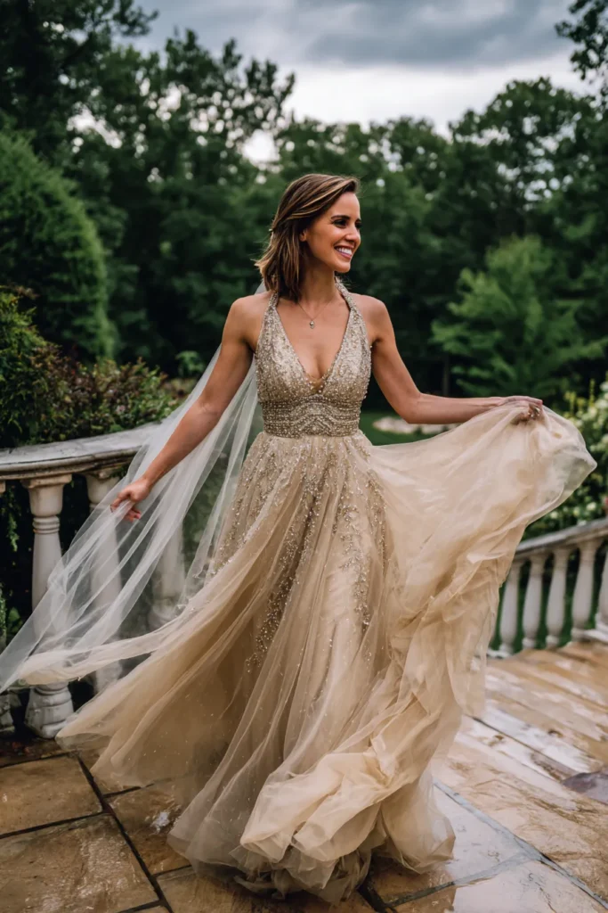 Talk about a showstopper, this bride looks like a glass of bubbly ready to celebrate. She is wearing a gorgeous A-line gown in a warm champagne or soft gold color, which is a beautiful alternative to traditional white. The dress features a flattering halter neckline with a plunging V-neck and a fully beaded bodice that shimmers with thousands of sequins and small pearls. This incredible beading continues down the skirt, which is made of soft, flowing tulle layers that catch the light with every move. She’s also wearing a sheer, matching draped veil or cape attached at the shoulders, adding an element of grand drama to the whole look.