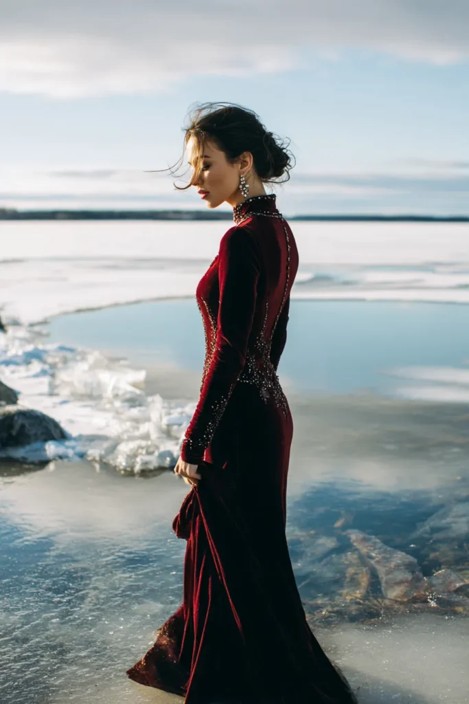 Now, this is what I call a dramatic, non-traditional winter look that truly sets the mood. This bride is wearing a stunning floor-length gown in a rich, jaw-dropping deep crimson or ruby velvet, perfect for capturing that festive winter feeling. The dress is long-sleeved with a chic high mock neckline, offering maximum coverage and warmth. The silhouette is slim-fitting, beautifully showing off her figure, and the back is detailed with intricate gold beading or embroidery that adds a royal, historical flair. She accessorized with bold statement earrings and a confident red lip, making her look like a majestic queen against the icy landscape.