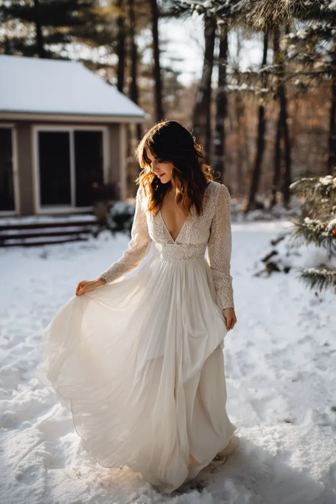 This is the perfect look for a rustic or bohemian winter wedding, combining coziness with effortless grace. This gorgeous bride is wearing a long-sleeved A-line gown in a soft, bright white or ivory, featuring a beautiful blend of textures. The bodice has a romantic lace overlay with a deep plunging V-neckline, and the sleeves are made of the same delicate lace. The skirt is absolutely stunning, made of layers of lightweight, flowing chiffon or georgette that billow around her in the snow. The overall vibe is super dreamy and relaxed, making her look like a woodland sprite found on a snowy day.