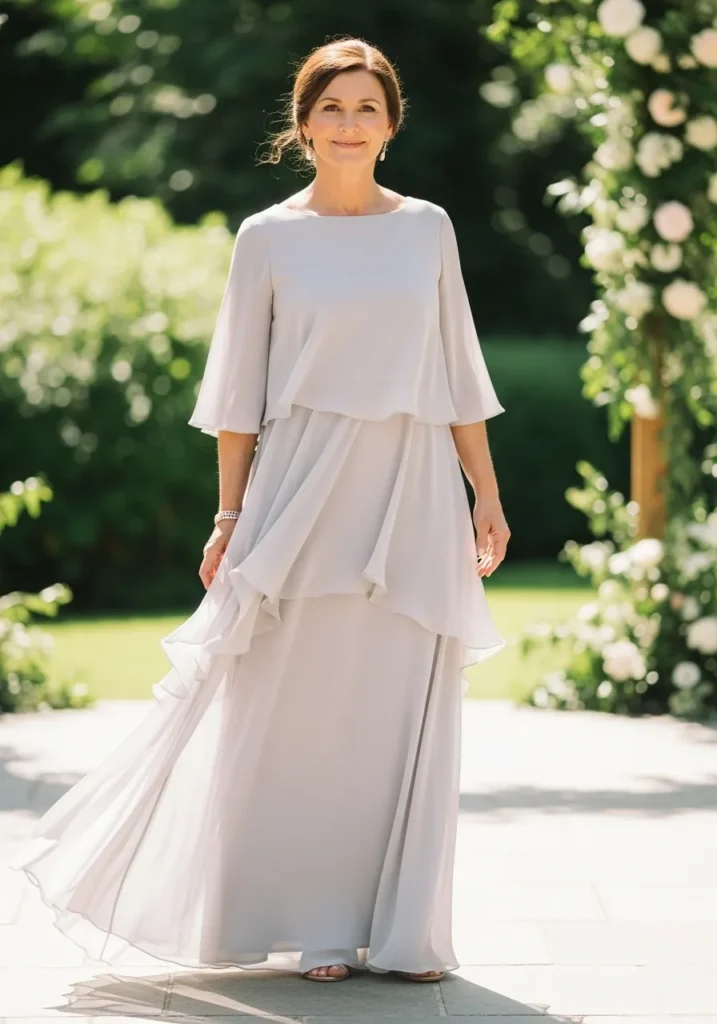 I adore how calm and polished this dress feels. The gentle layers add beautiful movement, and the muted gray tone makes it incredibly easy to style with soft florals and delicate accessories.