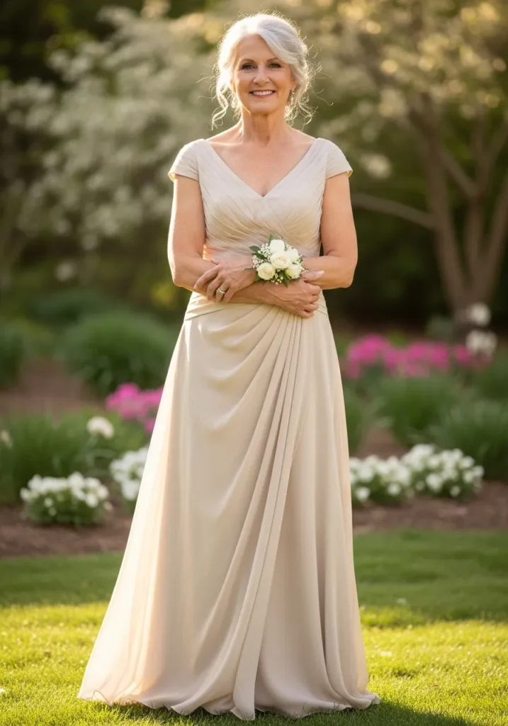 I love how romantic and warm this entire look feels. The soft champagne color flatters beautifully, and the wrap shape creates such an easy and graceful silhouette that feels perfect for heartfelt moments.