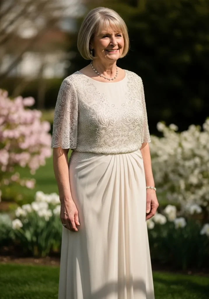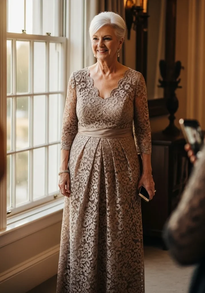 I love how timeless and sophisticated this look feels. The lace adds such a romantic charm, and the muted color keeps it modern and wearable, making it perfect for a polished and graceful mother of the bride style.