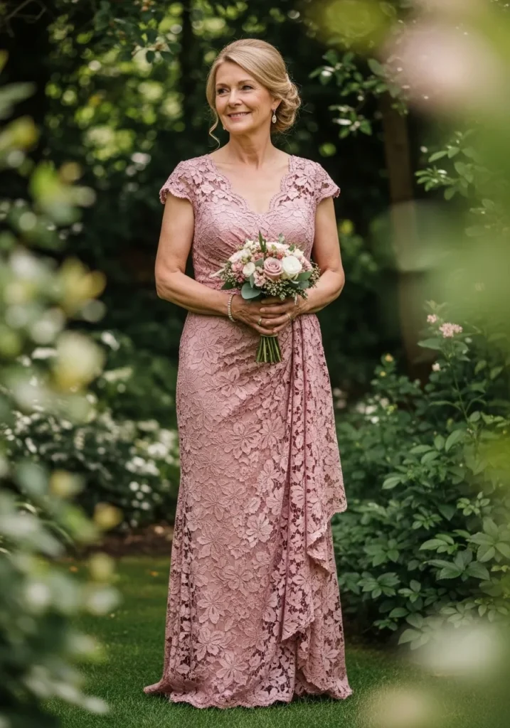 This look showcases a dusty rose lace gown with intricate floral patterns, a fitted bodice, and a flowing skirt that creates a refined and feminine shape. The soft texture of the lace adds depth and elegance, while the gentle neckline keeps everything feeling classic and timeless.