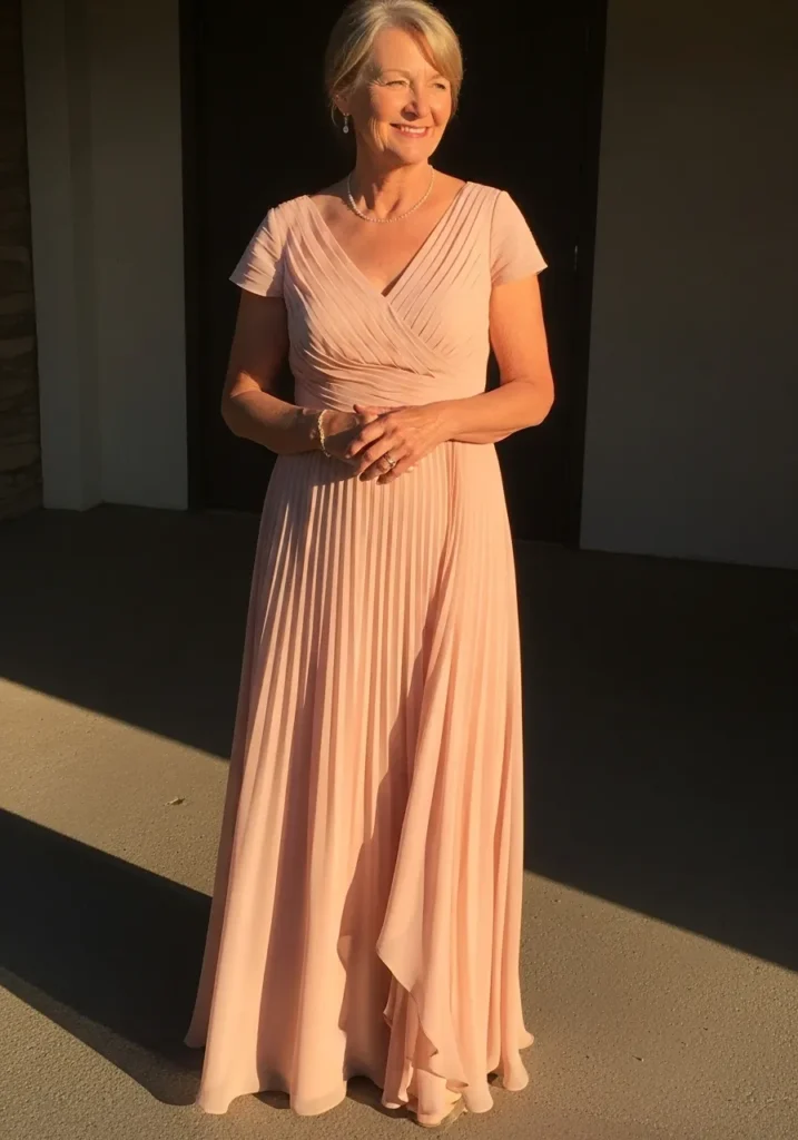 This gown highlights a peach pleated skirt paired with a wrap-style bodice that creates a flattering and elegant silhouette. The soft fabric catches the light beautifully, giving the entire look a gentle glow that feels fresh and joyful.