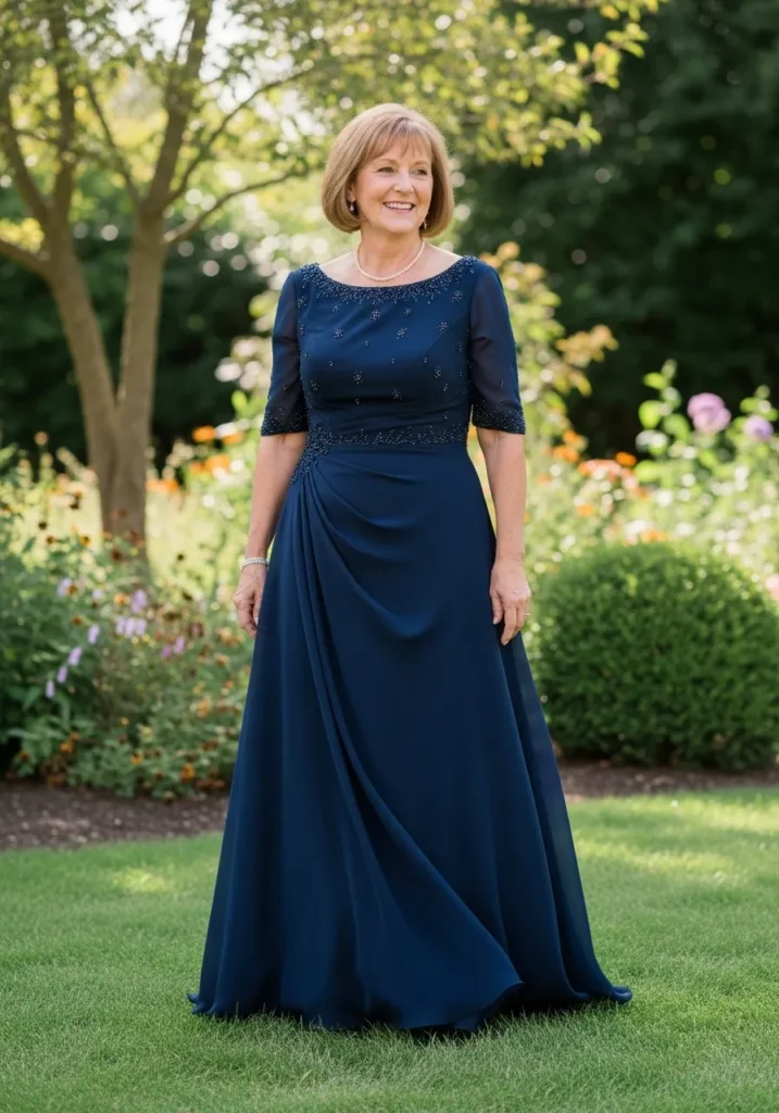 This gown showcases a deep navy chiffon skirt paired with a fitted bodice and soft short sleeves, creating a timeless and sophisticated silhouette. The rich color adds depth while the flowing fabric keeps the look light and comfortable.