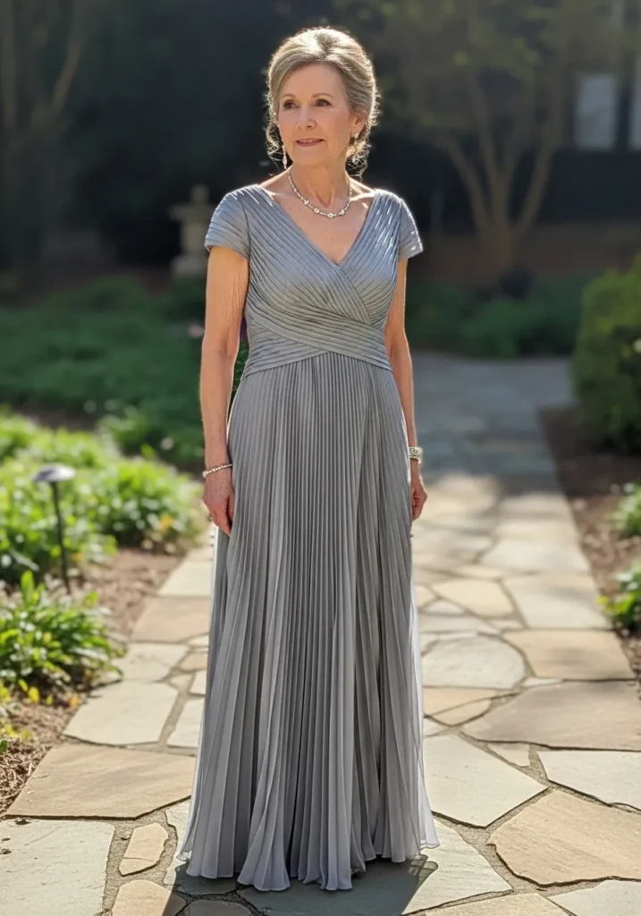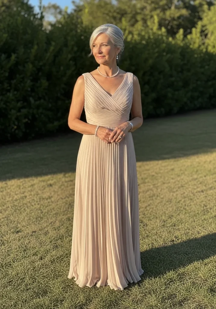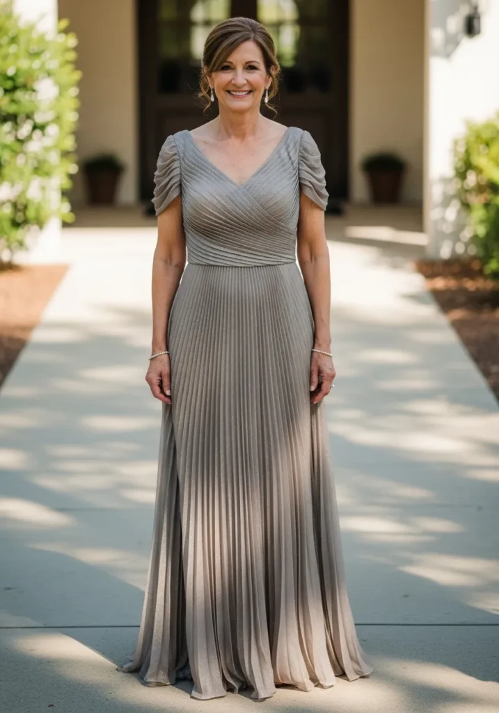 This look features a taupe pleated skirt paired with a softly fitted bodice that creates a flattering and elongated shape. The gentle shimmer in the fabric adds just a hint of glow without overpowering the overall design.