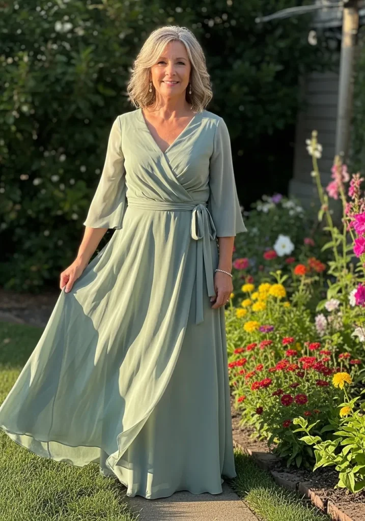 This gown highlights a soft sage green chiffon fabric with a wrap-style bodice and flowing skirt that moves naturally with every step. The gentle pastel shade feels fresh, calming, and perfect for outdoor spring settings.