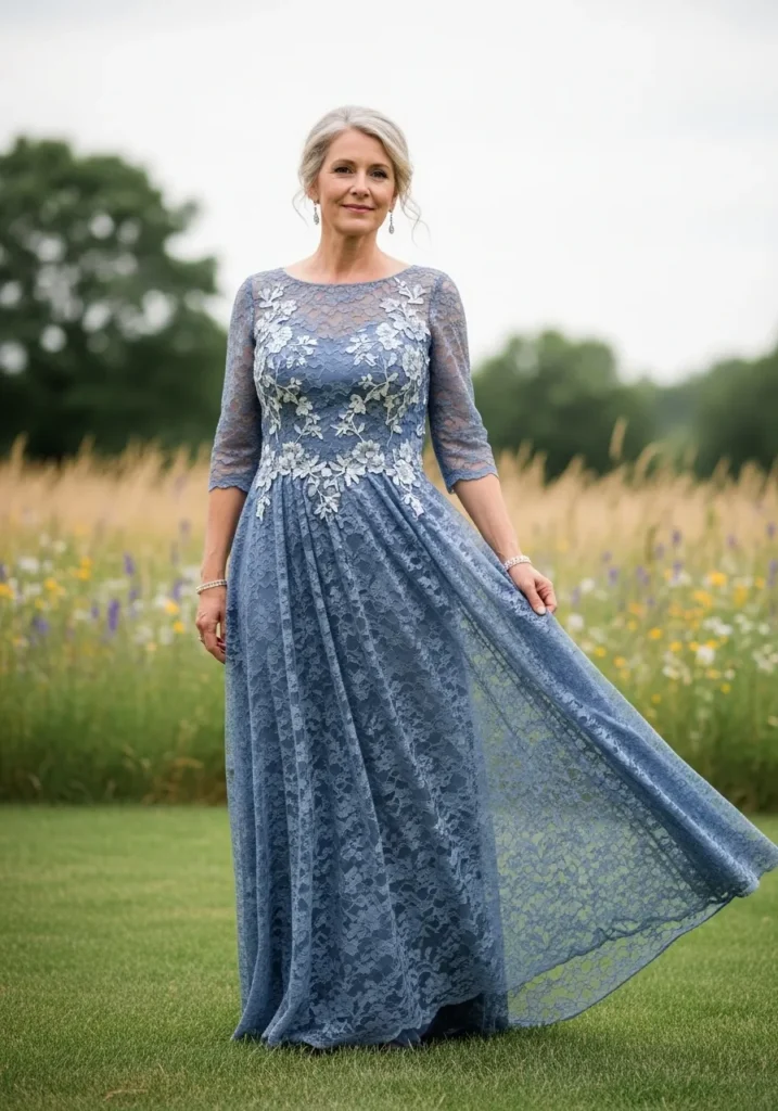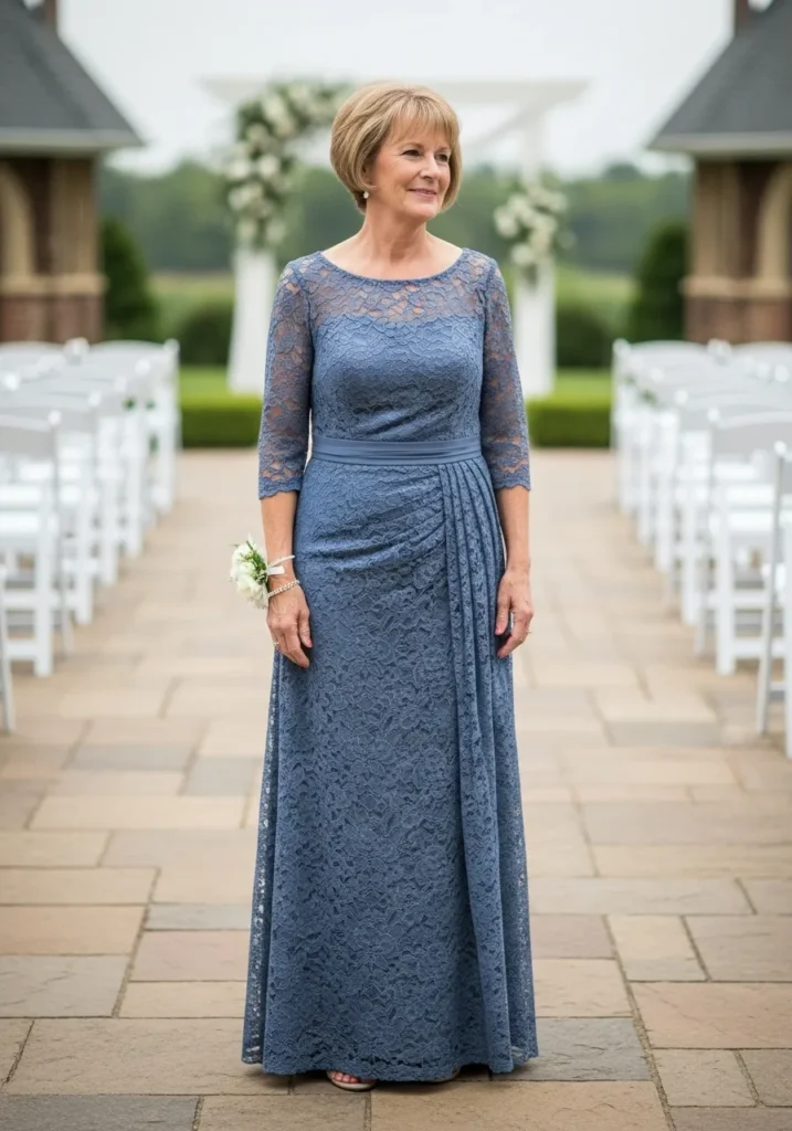 This slate blue lace gown features a fitted bodice, sheer lace sleeves, and a softly flared skirt that offers both structure and comfort. The detailed lace pattern adds depth and richness to the overall look.