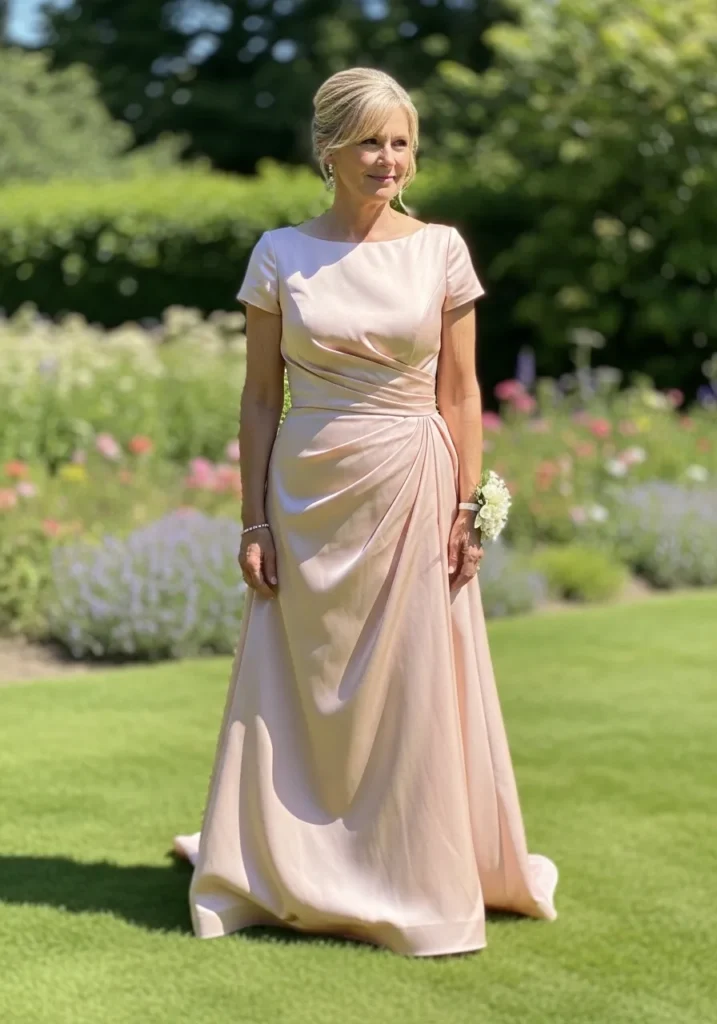 This design features a blush satin gown with a wrap-style bodice and gentle draping across the waist, creating a flattering and feminine shape. The smooth fabric catches the light beautifully, adding a subtle glow to the entire look.