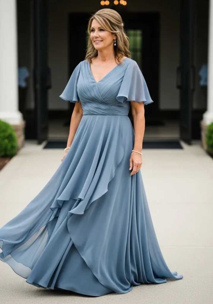 This look features a dusty blue chiffon gown with soft flutter sleeves, a gently wrapped bodice, and a flowing layered skirt. The lightweight fabric creates natural movement, giving the dress an airy and romantic finish.