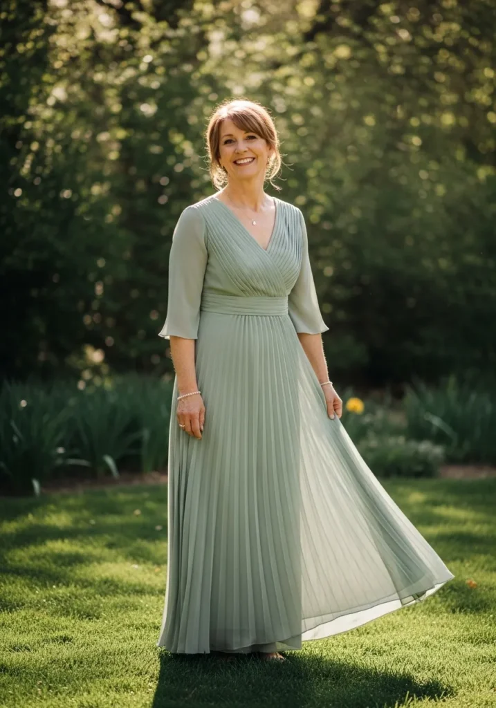 This gown showcases a soothing sage green tone paired with a pleated skirt and relaxed V-neck bodice. The light chiffon fabric creates a gentle flow that feels easy and natural.