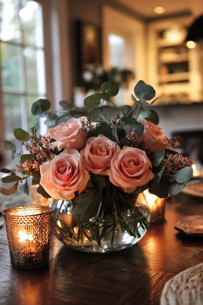 This centerpiece features soft blush roses arranged in a clear glass bowl with fresh eucalyptus leaves and delicate filler florals tucked in between. The stems are visible through the water which adds a clean and airy feel, while small candlelight nearby creates a warm glow around the arrangement. The color palette is gentle and romantic, with muted pinks and soft greens that feel perfectly suited for a spring wedding table.
