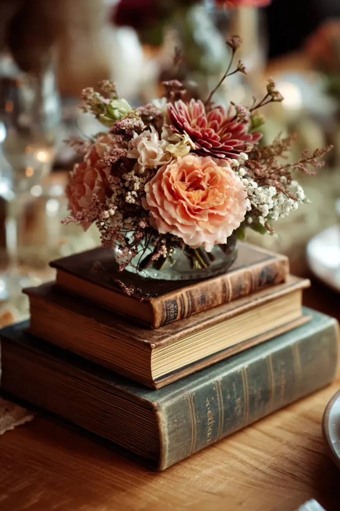 This centerpiece features a small floral arrangement resting on a stack of worn vintage books, creating a layered and nostalgic look. Soft peach and blush blooms mix with delicate filler flowers in muted creams and dusty pinks. The flowers sit low and compact, letting the aged book covers and textured spines become part of the design. Everything feels warm, collected, and full of quiet character on the wooden tabletop.