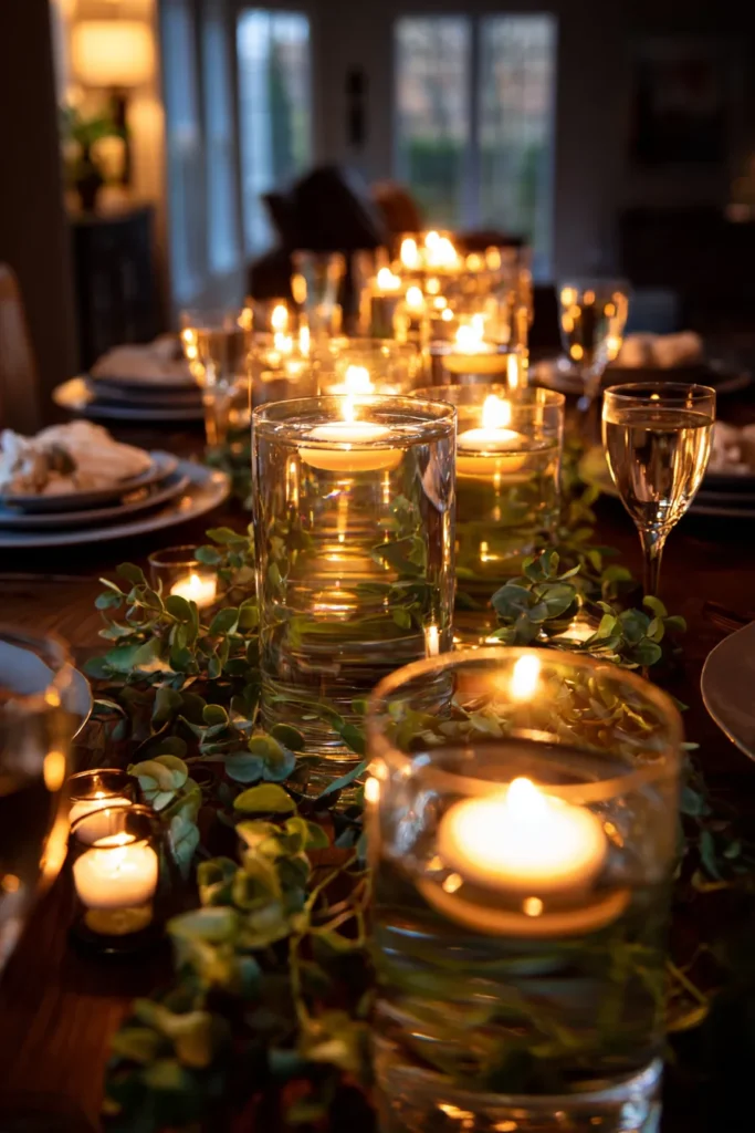 This table features clear glass cylinder candles filled with floating flames set along a lush greenery runner that stretches down the center of a wooden table. Small votives are scattered in between, adding extra sparkle and warmth. The greenery feels fresh and natural, softening the glow of the candles and giving the whole tablescape a romantic evening atmosphere that works beautifully indoors or out.