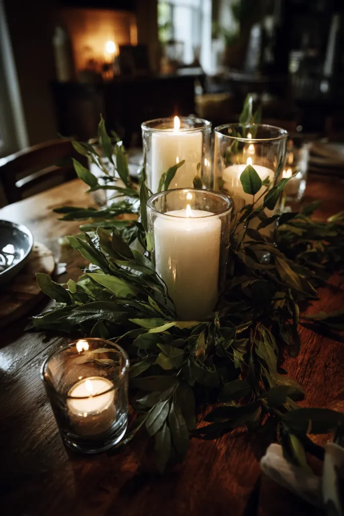 I love this idea because it feels incredibly elegant while using elements that are easy to source and reuse. Candles instantly make a space feel special, and pairing them with simple greenery keeps everything grounded and timeless. To me, this centerpiece feels intimate and inviting, like the kind of setup guests linger around long after dinner because the mood is just that good.