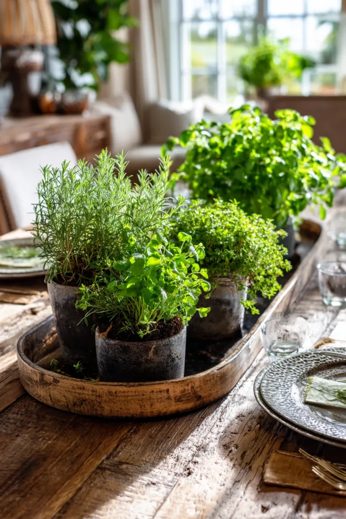 This centerpiece features small potted herbs like rosemary and basil arranged together in a shallow wooden tray. The rich green leaves look fresh and vibrant against the natural wood table, creating a relaxed and organic feel. Simple place settings and clear glassware keep the focus on the greenery, while natural light pouring in makes the whole table feel bright and inviting.