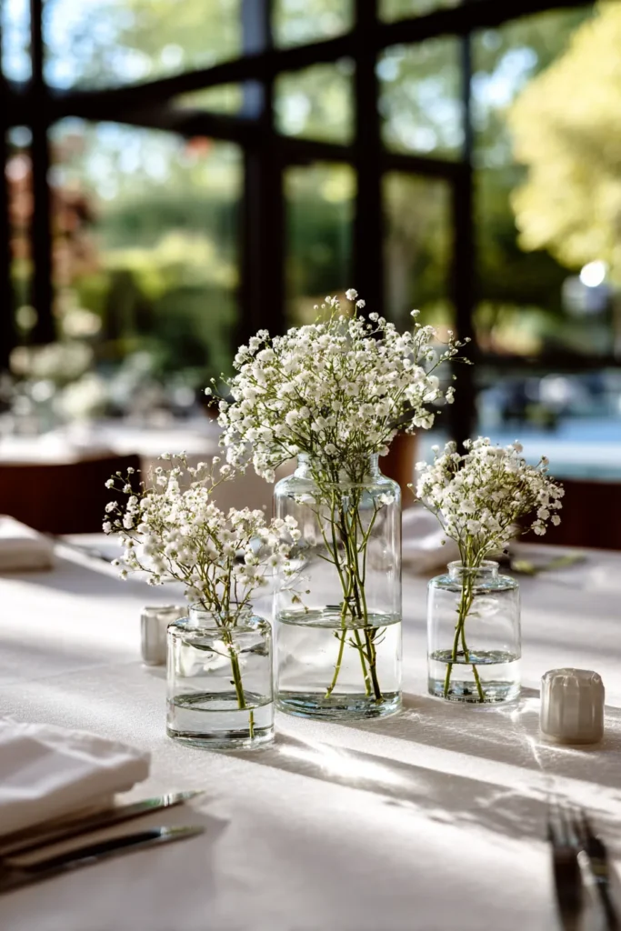 I love this idea because it proves simple can still feel incredibly elegant. Baby’s breath is budget friendly, but when it is styled this way it looks soft and romantic instead of basic. To me, it feels timeless and calm, and I especially love how it lets the space and the sunlight do most of the work while still making the table feel thoughtfully styled.