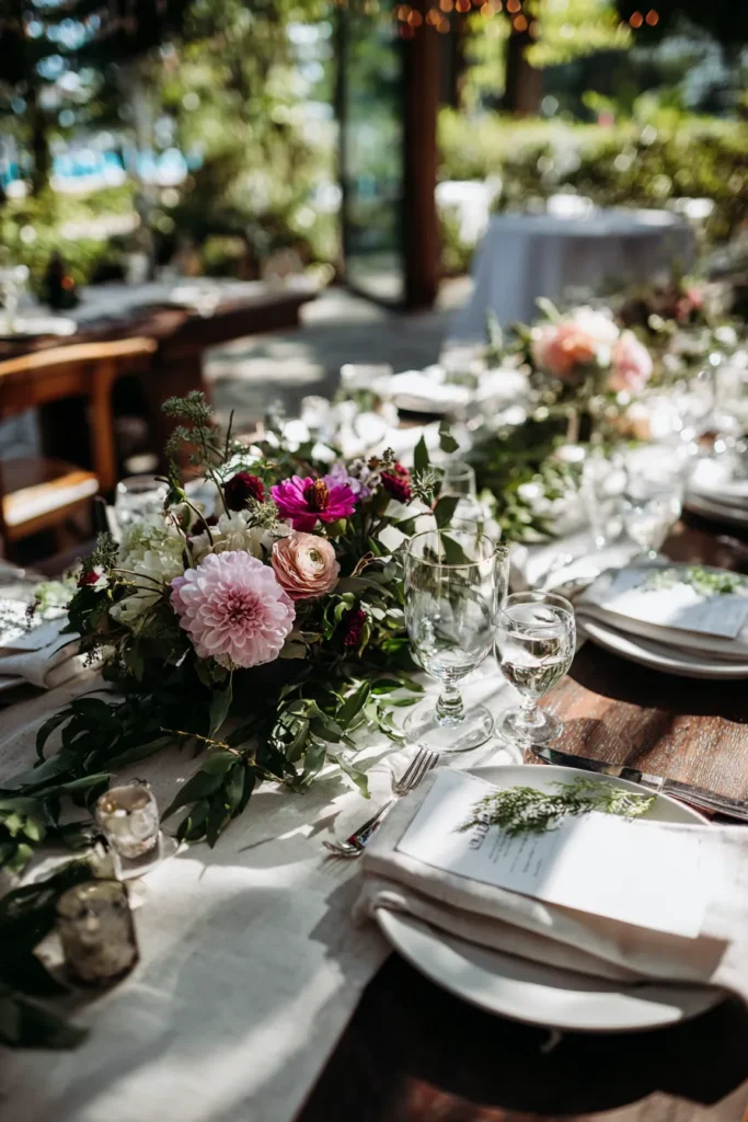 This tablescape features a flowing greenery runner accented with soft spring blooms in blush, cream, and deep berry tones. The florals are styled low and loose, weaving naturally through the greenery along the length of the table. Simple place settings, clear glassware, and white linens keep the focus on the flowers, while natural light and an open garden setting add to the relaxed elegance.