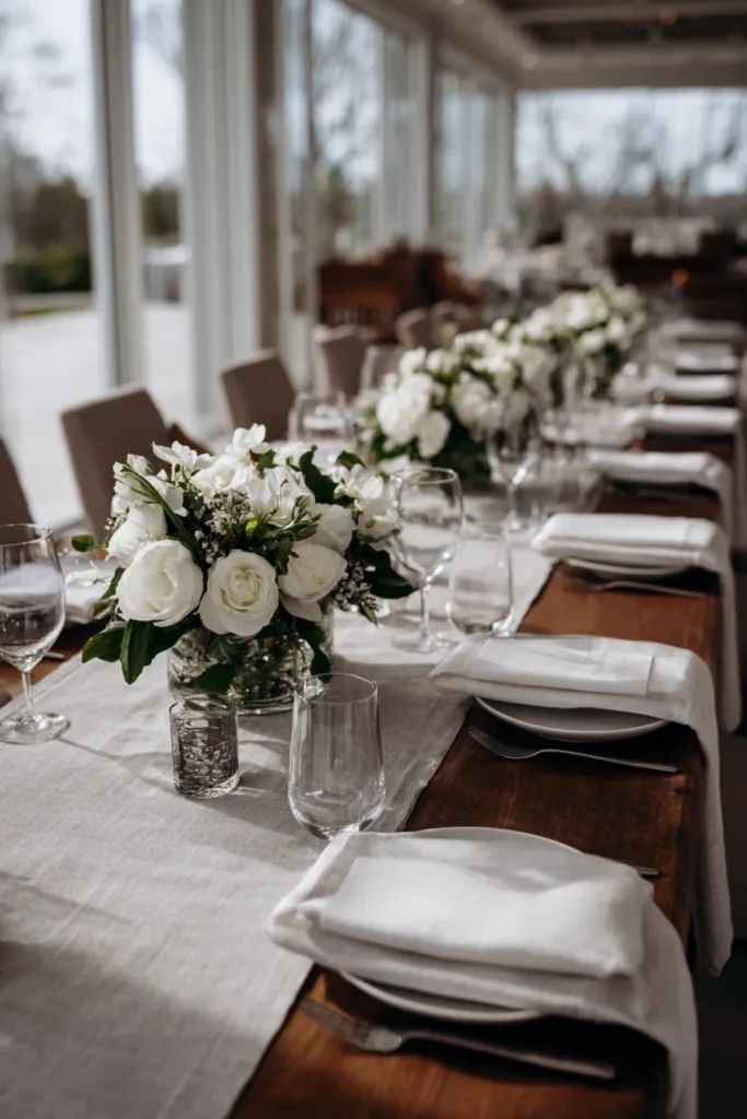 This tablescape features low white rose arrangements placed evenly down a long wooden table with soft neutral linens. The florals are paired with simple glassware, folded white napkins, and minimal place settings that let the flowers shine. Natural light pours in from large windows, giving the whole setup a fresh and airy feel that looks polished without feeling formal or heavy.