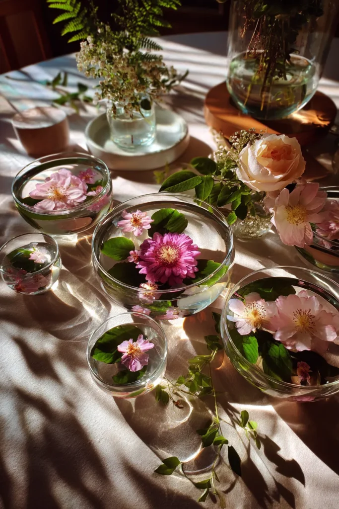 This centerpiece features clear glass bowls filled with water and soft spring blooms gently floating on the surface. Blush and pink flowers mix with fresh green leaves, catching the light and creating beautiful reflections across the table linens. Smaller glass bowls are scattered around the main arrangement, giving the whole table a layered and airy look that feels light, romantic, and perfectly suited for a spring celebration.