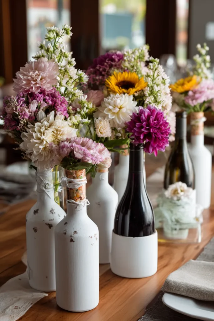 I love this idea because it feels creative and full of personality while staying incredibly budget friendly. Repurposed bottles are easy to collect and painting them instantly gives a curated look. To me, this centerpiece feels cheerful, artistic, and charming in a way that guests remember, and it proves that a little DIY effort can totally transform simple materials into something that feels special and high end.