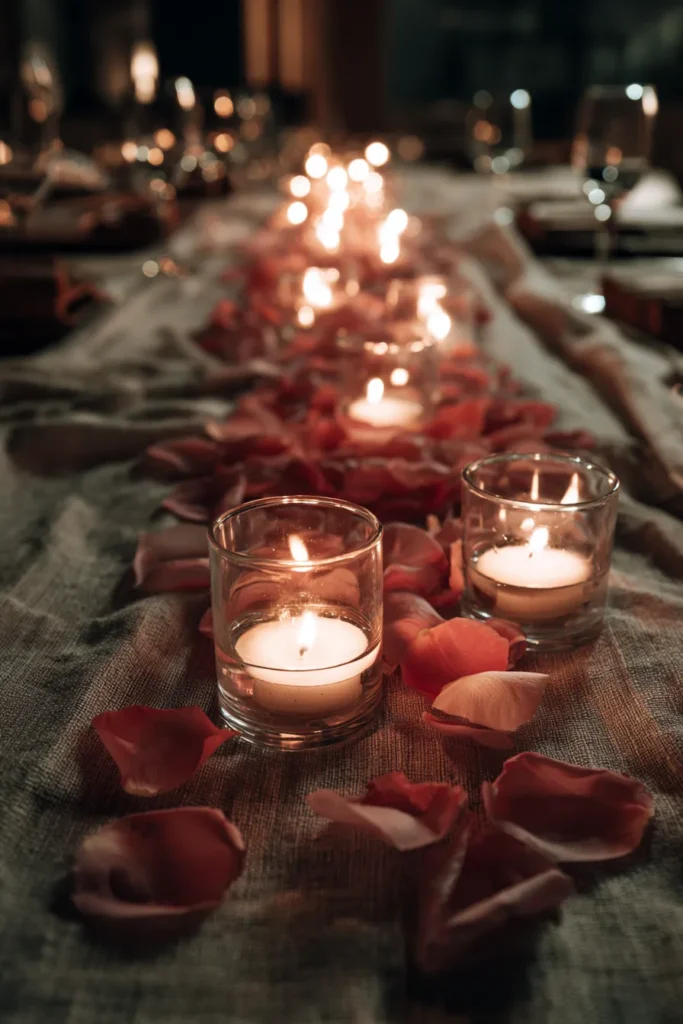 I love how this idea feels incredibly romantic without needing florals at every place setting. Rose petals are affordable and easy to source, yet they instantly set the mood. To me, this centerpiece feels cozy and luxurious in that quiet way that draws people in, and it proves that candlelight and a few thoughtful details can completely transform a table.