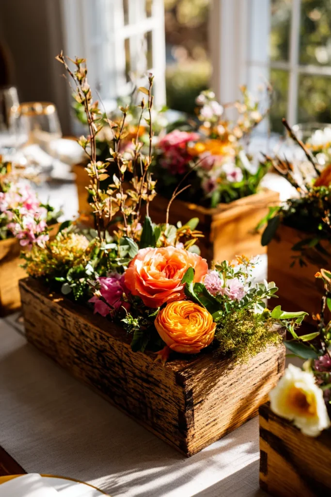 I love how this design feels handcrafted and thoughtful without looking too polished. Wooden boxes are affordable and easy to source, and they instantly give the table a cozy, welcoming vibe. To me, this centerpiece feels charming and full of life, like a little slice of a spring garden brought indoors, and it looks far more high end than the effort it takes to create.