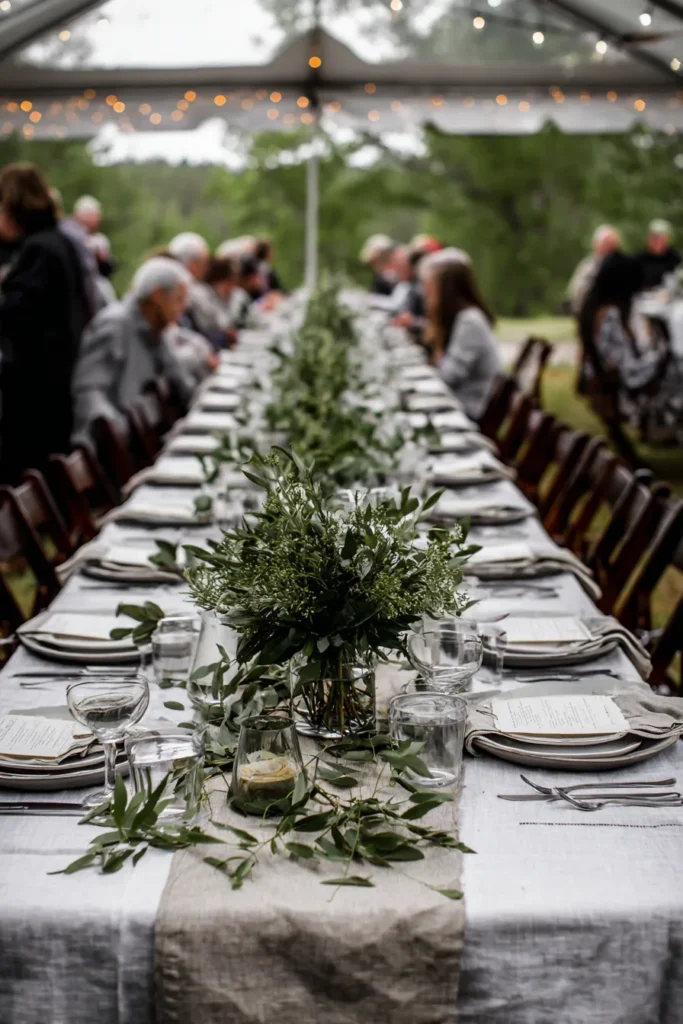 This tablescape features a lush greenery garland running the full length of a long reception table under a clear tent strung with warm lights. Soft neutral linens, simple place settings, and clear glassware keep the look clean and understated. The greenery spills naturally across the table, with loose leaves and stems creating a relaxed garden feel that blends beautifully with the outdoor setting.