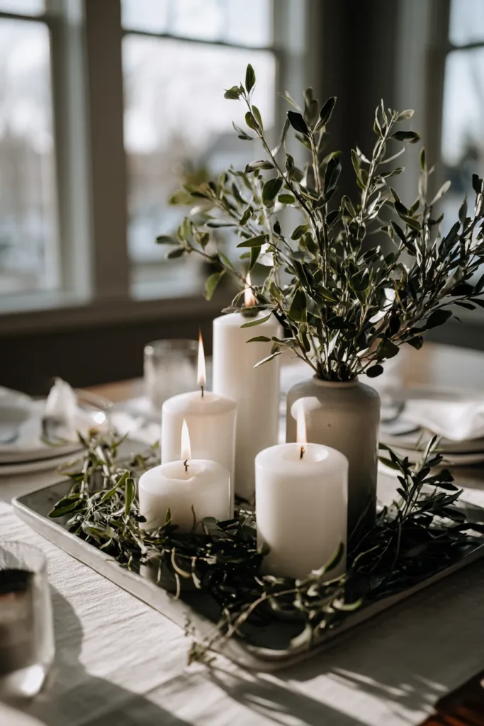 This centerpiece features a sleek rectangular tray holding white pillar candles at varying heights, surrounded by loose olive branches and a simple ceramic vase filled with leafy stems. The greenery is styled casually around the base, letting the soft candlelight bounce off the clean surfaces. Neutral linens and minimal place settings keep the overall look calm and refined, with natural light adding to the airy spring feel.